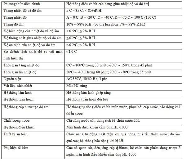 • Bảng điều khiển cảm ứng HL-1000: Màn hình cảm ứng sẽ hiện thị những thông số kỹ thuật cần thiết trong quá trình kiểm tra sản phẩm ví dụ: nhiệt độ, độ ẩm, thời gian. Thông qua màn hình cảm ứng, có thể điều chỉnh và lưu lại chương trình mà ta đã thiết kế để cho máy vận hành. Ngoài ra có thể cài đặt chế độ báo động khi vấn đề xảy ra nhằm bảo vệ sản phẩm.